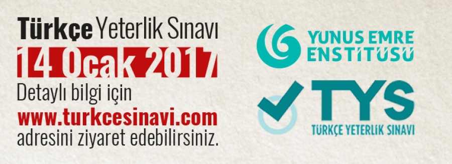 14.01.2017 tarihinde yurt dışında Yunus Emre Enstitüsü Türk Kültür Merkezlerinde, Ankara'da Yunus Emre Enstitüsünde Türkçe Yeterlik Sınavı (TYS) yapılacaktır.